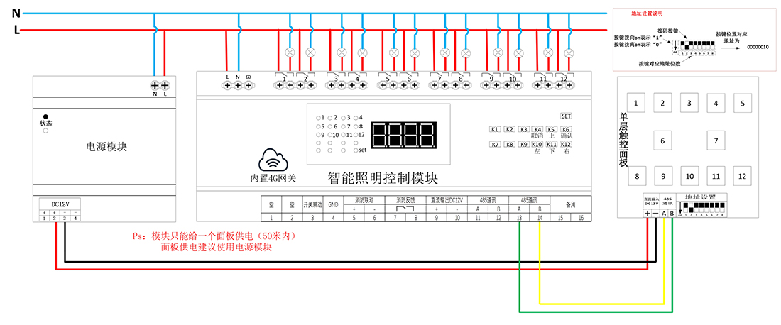 模块接通工作电压时,所有回路保持上次断电的工作状态。