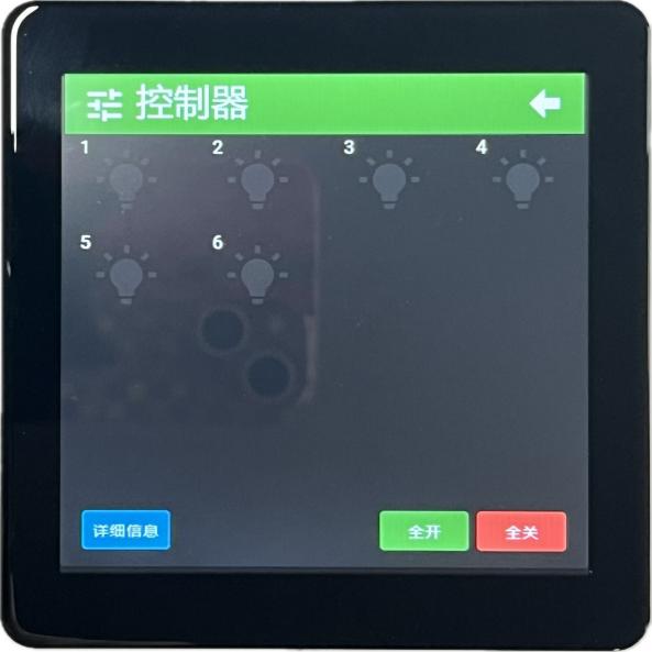 点击各模块名称进入模块设置界面,如图为照明模块的设置界面,点击灯泡图标即可控制对应通道开关,点击全开、全关按钮可实现一键全开全关。