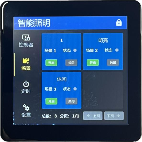 点击场景图标,可以进入场景管理界面,在该界面可以简单查看当前中控屏中设定的场景以及当前设定场景的开关状态。