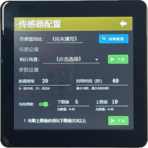 选择传感器地址,设置传感器所关联的场景,设定触发的传感器的条件:距离等级、持续时间;光敏强度触发的上限和下限条件,点击下发完成配置。