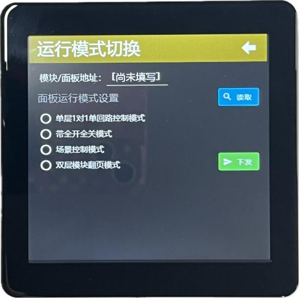 配置中还有运行模式切换功能,可切换触摸面板单层1对1回路控制模式、全开全关模式、场景控制模式、双层模块翻页模式。