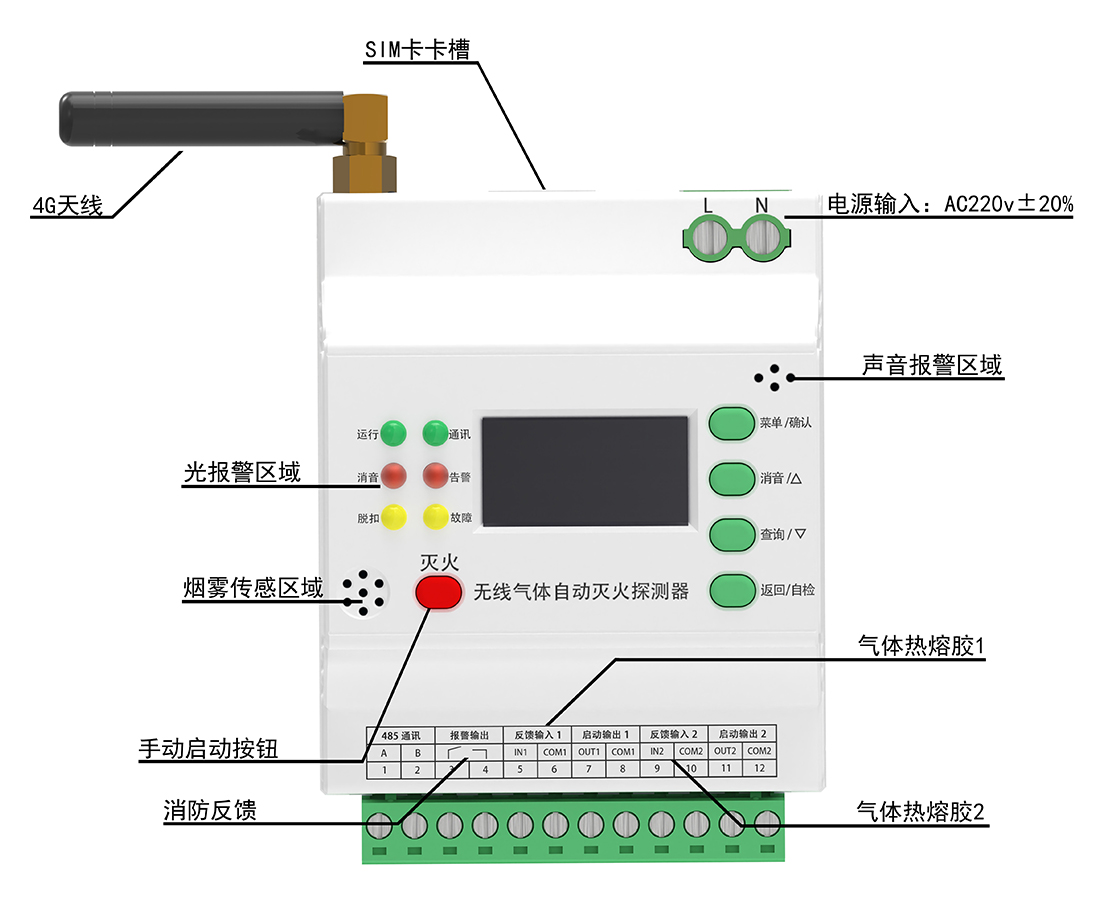 1、带消防控制逻辑:上电可实现声光功能自检,带消防反馈功能、带消音、复位功能,报警状态持续到手动复位;