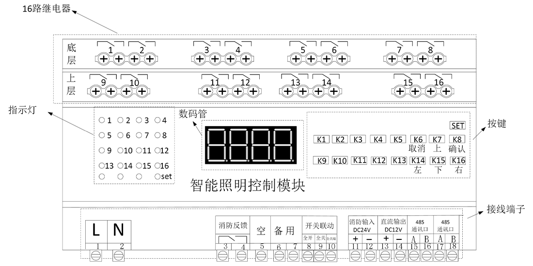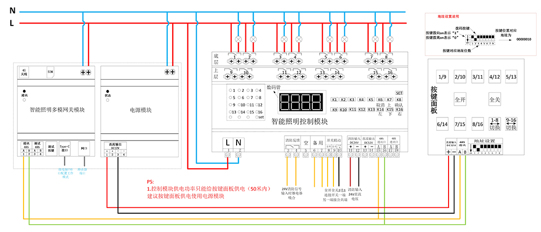 控制模块可以广泛应用于酒店、场馆、火车站、停车场、机场、商业大楼、餐厅等照明场。控制模块集成一键总开功能、消防联动功能,可以根据照明场合,灵活配置功能。支持本地按键控制,人机交互性好。支持网关通信,可通过上位机、手机app实现远程控制和配置场景一键配置。