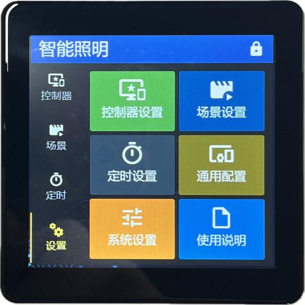 进入主界面,系统分为四个功能,分别为时控、控制器、场景和设置功能,右上角蓝色按钮为锁屏键,点击即可锁屏。