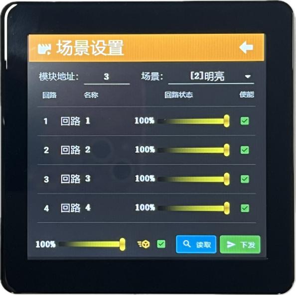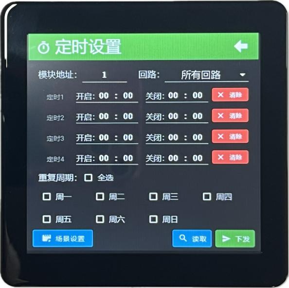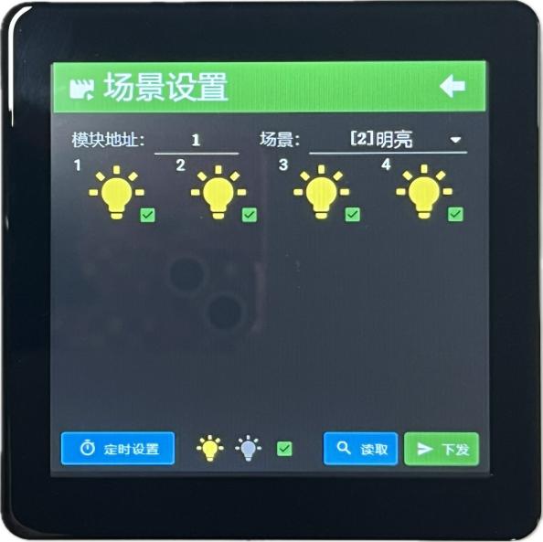 回路选框中可选择对所有回路或者单个回路进行定时设置,下方定时1~4,可以设定所选回路开启和关闭的时间段,并支持对星期的定时设置,定时参数设置完毕后,即可选择下发完成定时设置,点击读取则是读取模块中已存在的定时设置。对调光模块的场景设置同上。