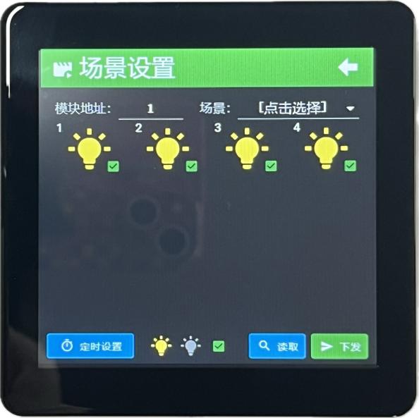 点击场景选择添加好的场景,点击灯泡图标控制每个场景中各回路的开关。点击下方方框可以批量设置通道全开全关状态。设置好后点击下发即可下发场景配置至时控模块中,点击读取可以快速读取对应地址模块中已经存在的场景配置。