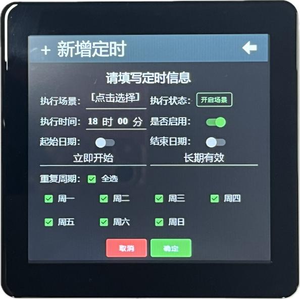 在此界面中即可编辑定时执行的场景,并设置启用状态、起止时间段和日期以及星期重复周期,点击确认,完成定时设置。