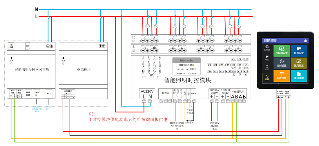 采用钢化玻璃触摸材质,超长按键寿命,时尚美观高档。面板通过RS485总线与电脑系统软件编程实现 不同的功能 不同的场景设置如:全开、全关触发场景、 组控制、 交叉控制多点控制各个模块等,可自由组合多个面板实现多个场景设置。面板的总电源12V要由外部提供。