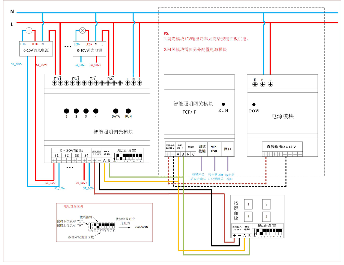 智能照明控制系统由开关模块、调光模块、场景控制面板、 时钟控制器、干节点输入模块、红外传感器、光照度传感器、GPR模块、系统网关等设备组成,将上述各种具备独立控制功能模块的通讯联接起来组成一个控制网络。 智能调光模块广泛应用于酒店、场馆、火车站、停车场、机场、会所、餐厅、别墅、学校、商业大楼、家庭等。实现对调光灯具的亮度调节控制,从而达到节能,为用户提供舒适的灯光照明环境。
